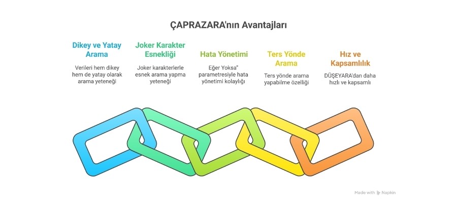 ÇAPRAZARA (İngilizcesi XLOOKUP), Excel 365 ile gelen yeni nesil arama fonksiyonudur. Verileri dikey ve yatay aralıklarda arayabilir, tam veya yaklaşık eşleşme yapabilir, hata durumlarını özelleştirebilir. Eski formüllere göre çok daha işlevseldir.