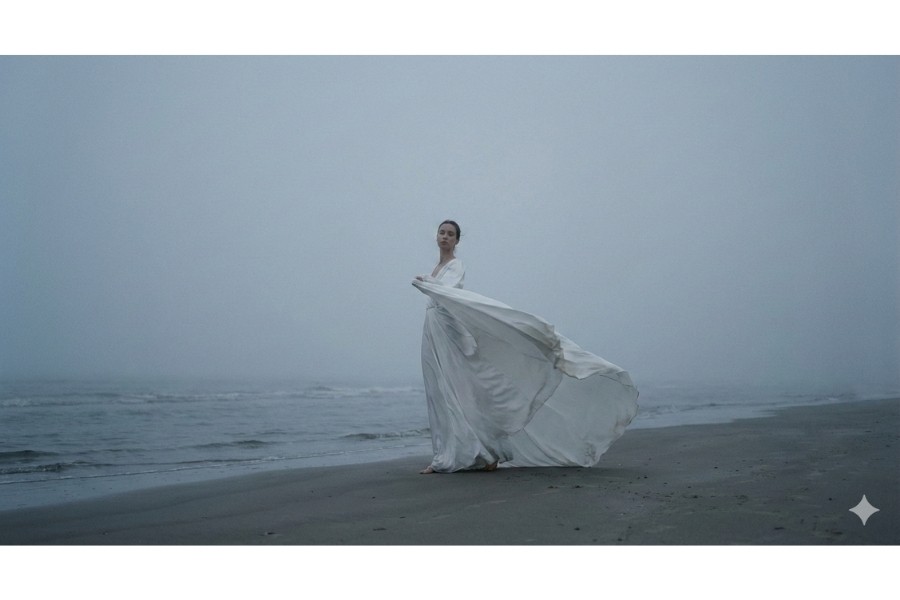 "Yoğun sisli bir sabah, deniz kenarında rüzgarla dans eden uzun, beyaz elbiseli bir modelin tam boy moda fotoğrafı. Minimalist kompozisyon, gri ve mavinin tonları, fotoğraf, profesyonel çekim."