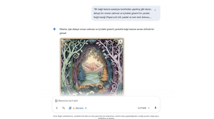 "Bir kağıt kesme sanatçısı tarafından yapılmış gibi duran, detaylı bir orman sahnesi ve içindeki gizemli bir yaratık. Kağıt kesiği (Papercut) stili, pastel ve mat renk dokusu, katmanlı derinlik."