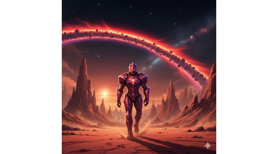 "Mars'ın kızıl kumları üzerinde yürüyen, kristal zırhlı bir şövalye. Güneş sisteminin halkaları gökyüzünde belirgin. Epik bilim kurgu illüstrasyonu, kızıl, turuncu ve mor renk paleti, dijital resim."