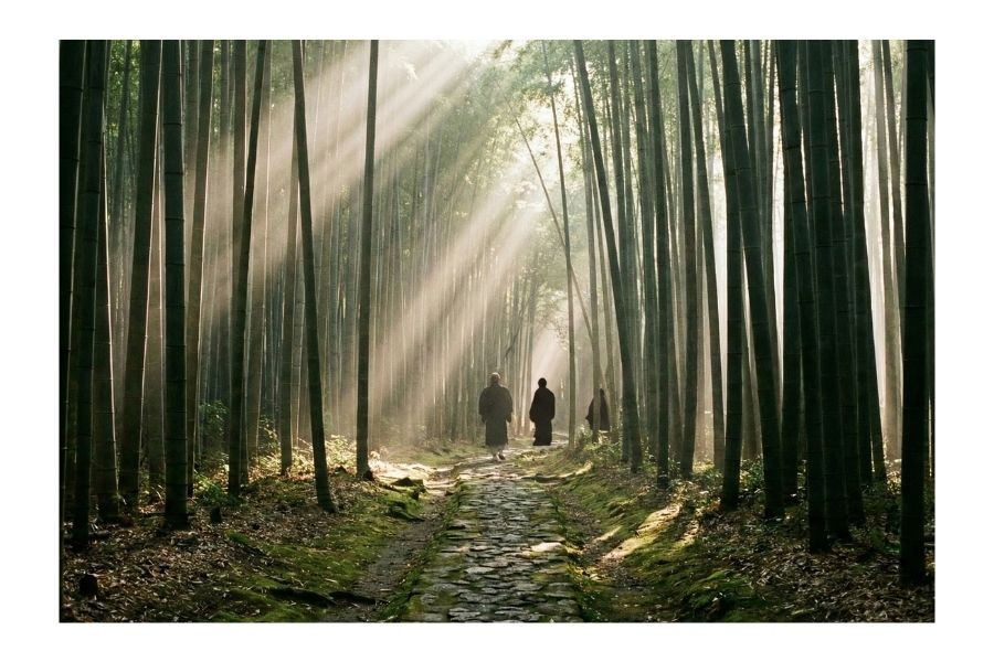 "Japonya'da bambu ormanının derinliklerinde yürüyüş yolu. Yüksek dikey çizgiler, orman içinden süzülen güneş ışığı huzmeleri (god rays), huzurlu, zen atmosferi, fotoğraf, teleobjektif."