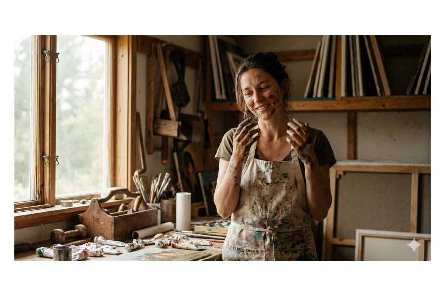 "Rustik bir atölyede, elleri yağlı boya lekesi olmuş bir sanatçı kadın portresi. Yan pencereden gelen yumuşak gün ışığı, sıcak tonlar, fotoğraf, 4K, Hasselblad efekti."