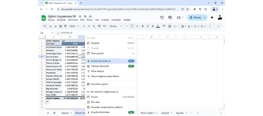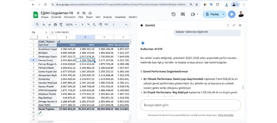 Google, veri analizi yapan herkes için oyunun kurallarını değiştirecek bir yenilik getirdi: Gemini ile Pivot Tablo Analizi. Artık verileri dışarı aktarmaya veya karmaşık formüllerle uğraşmaya gerek yok — Gemini, E-Tablonuzun içindeyken tüm tabloyu anında yorumlayabiliyor.