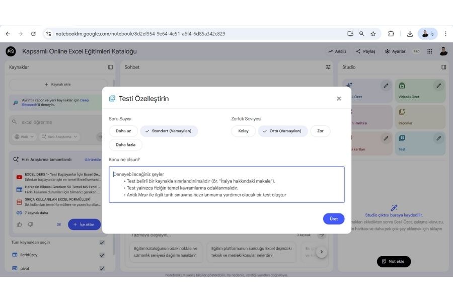 NotebookLM, sizin yüklediğiniz ders notlarından, araştırma makalelerinden veya okuma parçalarından yola çıkarak size özel testler hazırlıyor.
